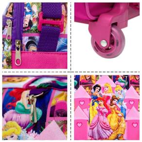 Kit Mochila Escolar Infantil Princesas Rodinhas, acompanha lancheira e estojo. Possui alça de mão reforçada. Agora você pode levar sua mochila no seu dia a dia ou acompanhar você na escola. Sua abertura maior se dá por zíper com puxador. Na parte de dentro possui amplo espaço para a guardar diversos materiais como cadernos, livros e estojos. Na parte da frente, possui bolso com zíper para a guardar pertences de menor tamanho e bolsos laterais.