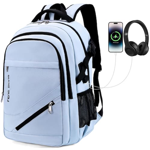 Mochila para laptop - ? Bolsos grandes e multiusos ? Dimensões externas: 47 cm A x 30 cm C x 21 cm L; o compartimento principal tem interior espaçoso, não só é capaz de acomodar os laptops mais populares de 17,3 polegadas, mas também pode guardar eletrônicos tecnológicos e necessidades diárias facilmente, e três bolsos frontais externos generosos podem armazenar acessórios essenciais muito bem. - ? Acessórios modernos e práticos? Esta mochila elegante possui porta micro-USB externa e porta de fone de ouvido de 3,5 mm para oferecer a você uma maneira mais criativa de carregar seu dispositivo eletrônico e tornar uma experiência de uso mais conveniente. E a interface do fone de ouvido libera suas mãos ao desfrutar de áudio, música, etc. Enquanto isso, observe que esta mochila não inclui um carregador portátil. - ?Design prático? A alça de peito com fivela apito e design de alça de bagagem ajuda você a travar sua mochila no lugar com segurança. Os bolsos laterais elásticos de rede são convenientes para guardar guarda-chuvas ou garrafas de água. Design adequado para faculdade, negócios, viagens, acampamento, caminhada e outros usos diários. - Qualidade superior e artesanato premium: feita de tecido Oxford resistente à água e zíperes de metal duráveis, protege seu dispositivo contra chuva leve e derramamentos acidentais (não é recomendável deixar de molho por muito tempo). O forro resistente adiciona proteção adicional ao redor das bordas. Alça superior ergonômica para um longo tempo de transporte. - ? Sistema confortável: o acolchoamento ventilado macio com vários painéis proporciona o máximo de fluxo de ar traseiro e suporte. Alças de ombro respiráveis e ajustáveis aliviam o desconforto do ombro. Se você tiver alguma dúvida, não hesite em entrar em contato conosco. - Este item não se destina a ser utilizado por crianças menores de 12 anos.