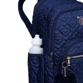 E que tal viver um belo romance junto da mochila grande 2 compartimentos capricho crush azul marinho Produzido em nailon Material bem resistente Possui alças anatômicas para maior conforto dos ombros. Tem bolso frontal com fechamento por zíper Bolsos laterais com elástico para pequenos objetos ou garrafinha Alça de mão e puxadores em tiras de cadarço. Este modelo acompanha um lindo acessório.