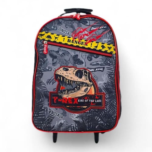 Design exclusivo de dinossauro, com cores vibrantes e compartimento tipo porta lapis caneta Rodinhas super resistentes e haste moderno 1 puxador de alumínio Alças ajustaveis, resistente e acolchoadas dando opção de transporte nas costas com comodidade Espaço interno bem distribuído para livros, cadernos e materiais, compartimento extra para laptop Fecho seguro e fácil de abrir, perfeito para as crianças
