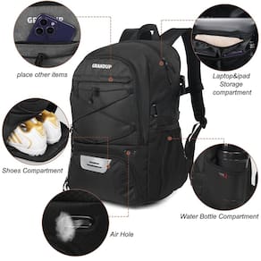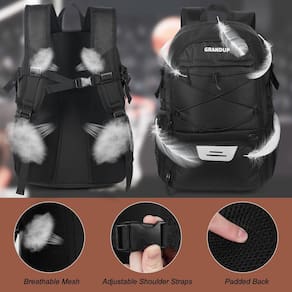 Mochila de basquete GRANDUP com compartimento para bolas e sapatos serve para voleibol, futebol, natação, academia, viagens, bolsas de equipamentos de treinamento esportivo de grande capacidade - Capacidade: 28 litros. Muito espaço com 12 bolsos disponíveis para todos os seus acessórios. - Compartimentos dedicados: um bolso para uma bola de basquete, futebol, vôlei, futebol e muito mais em tamanho real. Um bolso para sapatos. Um bolso adicional de armazenamento rápido na frente. 2 bolsos laterais de malha maiores que cabem em garrafas ou bombas de até 64 onças, toalhas e meias. Uma organização interna multifuncional no compartimento principal, com laptop, telefone, carregador, caderno, caneta e bolsos extras que oferecem espaço para itens menores. - Características principais do design: compartimento frontal espaçoso com elástico que ajusta o cabo de tração para guardar facilmente uma roupa. Ambos os lados têm tiras de compressão para fixar a garrafa de água e a engrenagem. Ajuste respirável da alça de ombro com alça peitoral. - Durabilidade: 101% poliéster durável e resistente à água. - Respirável: alças acolchoadas e encosto, confortável compartimento ventilado para sapatos, fácil de limpar.