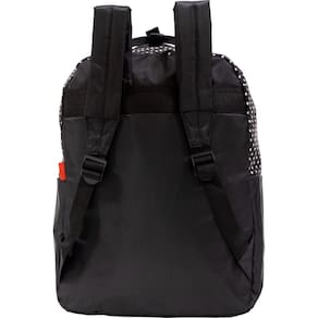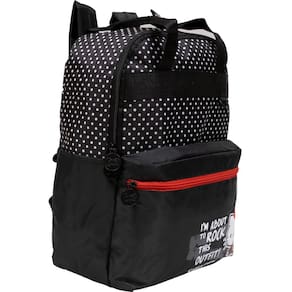 Possui um compartimento principal amplo e um bolso frontal, ambos com fechamento de zíper com puxadores personalizados Também tem dois bolsos laterais e detalhe de laço destacável Alças acolchoadas com regulagem de tamanho para maior conforto