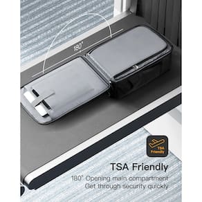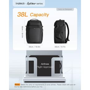Inateck Mochila de viagem para laptop de 40L, compatível com TSA, aprovada por voo, com compartimento separado para sapatos, bagagem de mão resistente a respingos para homens e mulheres, compatível - Compatível com TSA: o compartimento principal da mochila pode abrir 180° para verificações rápidas de segurança, eliminando a necessidade de remover o laptop e outros itens. Um lado possui um compartimento para laptop compatível com laptops de 17 polegadas e um compartimento para tablet. O outro lado tem um compartimento de bagagem com um divisor com zíper para armazenamento separado de roupas - Armazenamento organizado: as dimensões são 52 x 33 x 22 cm, atendendo aos requisitos da maioria das companhias aéreas. A mochila tem 2 bolsos ocultos com zíper sob as alças e na parte traseira esquerda para acesso fácil e seguro a documentos essenciais, 2 bolsos expansíveis para garrafa de água e 2 bolsos com zíper que armazenam itens como cabos de carregamento para acesso rápido durante a viagem. Observação: confirme os requisitos de tamanho com a companhia aérea antes de viajar - Compartimento separado para sapatos: a parte inferior da mochila tem um compartimento de sapato macio com zíper separado com uma abertura de 26 x 16 cm e uma profundidade de 31 cm, que não comprime outros espaços de armazenamento quando não estiver em uso. Pode acomodar um par de chinelos ou sapatos esportivos de forma limpa, permitindo que você aproveite ao ar livre a qualquer momento - Respirável e confortável: a malha de ar no painel traseiro e as alças ajustáveis no peito ajudam a aliviar a pressão nos ombros e aumentar a estabilidade da sua mochila. As tiras de compressão laterais podem minimizar o volume da sua mochila, trazendo a carga para mais perto de suas costas para equilíbrio e conforto - Conveniente para viagens: esta não é apenas uma mochila de viagem com alças de ombro, mas também uma bagagem de mão durável com duas alças. 3 maneiras de carregar para atender às suas várias demandas. A fivela no peito pode passar pela alça de bagagem para prender as alças ao transportá-la na lateral. As tiras refletivas nas alças de ombro podem melhorar as viagens noturnas