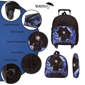 Kit Mochila Escolar Infantil Wandinha Rodinha, acompanha lancheira e estojo. Possui alça de mão reforçada. Agora você pode levar sua mochila no seu dia a dia ou acompanhar você na escola. Sua abertura maior se dá por zíper com puxador. Na parte de dentro possui amplo espaço para a guardar diversos materiais como cadernos, livros e estojos. Na parte da frente, possui bolso com zíper para a guardar pertences de menor tamanho e bolsos laterais.