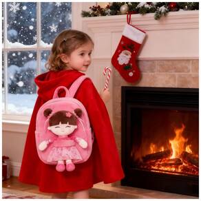 A mochila infantil Gloveleya boneca asiática rosa é indicada para crianças pequenas, com corpo em pelúcia macia e boneca integrada vestida em tons de rosa, em formato compacto e leve, com compartimento principal adequado para pequenos brinquedos, lanches, acessórios e um tablet infantil de até aproximadamente 8,5", para uso em passeios, escola infantil e atividades de lazer. ?