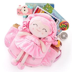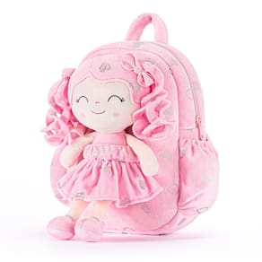 - Design encantador da boneca de pelúcia: apresenta uma boneca rosa de cabelo encaracolado com detalhes de coração prateado, adicionando um toque peculiar às aventuras diárias do seu filho.