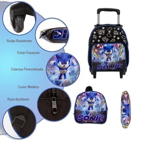 Marca: Toys 2U Modelo: Sonic Material: Poliéster Características principais: Rodinhas, Estampa no bolso frontal, Zíper metálico, Bolso Lateral.