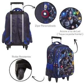 Mochila Escolar Infantil Batman Led Rodinhas possui alça de mão reforçada. Agora você pode levar sua mochila no seu dia a dia ou acompanhar você na escola. Sua abertura maior se dá por zíper com puxador. Na parte de dentro possui amplo espaço para a guardar diversos materiais como cadernos, livros e estojos. Na parte da frente, possui luzes de led que piscam, tornando-a ainda mais divertida e atraente.