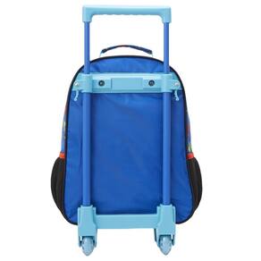 A mala com rodas é confeccionada em poliéster resistente, com painel frontal em PVC vincado e puxadores de zíper personalizados em metal. Ela conta com um compartimento principal espaçoso, dois bolsos laterais em redinha, haste com trava e rodinhas em gel para facilitar o transporte, além de uma alça de mão em poliéster reforçado com nylon.
