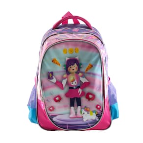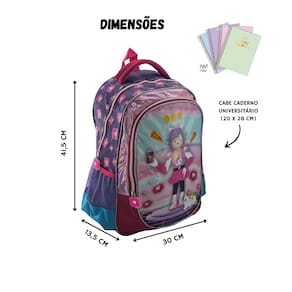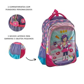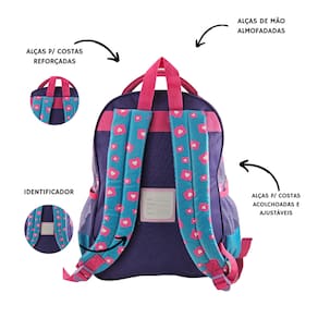 Mochila infantil feminina de qualidade, ótimo espaço interno, com 2 divisórias e 2 bolsos laterais, com cursores dos zíperes personalizados, alças de ombros acolchoados e ajustáveis, 1 etiqueta de identificação da criança e alça de mão acolchoada.