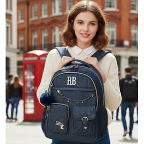 Características Mochila: - Alça de mão - Alça de costas - Alça carona - Bolso antifurto - Bolsos Laterais - Confeccionados em material jeans com Matelassê - Chaveiros pompom com orelhinhas, plaquinhas de metal e correntinha com strass em ouro velho - Logo RB em metal - Zíper tratorado com puxadores com cadarço - Compartimentos para laptop + tablet- Forro rossa listrado