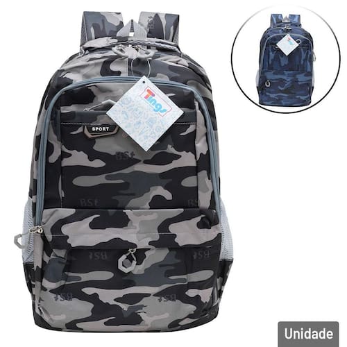 Mochila Juvenil 18'' 44cm Fashion Camuflada C Esta Mochila Juvenil de 18 polegadas (44cm), com design Camuflado é a escolha perfeita para quem busca praticidade e estilo no dia a dia. Feita com materiais duráveis e de alta qualidade, ela oferece amplo espaço, com um 2 Compartimentos grandes, com abertura extensa, 2 compartimentos menores, com abertura em zíper personalizado. A Mochila conta com um design moderno e contemporâneo, adicionando um toque de charme ao visual. Com alças ajustáveis e confortáveis, esta Mochila oferece facilidade no transporte e é ideal para adolescentes que buscam praticidade, sem abrir mão de um toque divertido e fashion. A Mochila oferece amplo espaço para organizar livros, cadernos, materiais de escola e outros itens essenciais. Além disso, conta com 2 bolsos laterais, ideais para guardar garrafinhas de água ou pequenos acessórios. Sua composição em Poliéster garante durabilidade e resistência para o uso diário.\nDisponível em cores.\nEspecificações:\nMarca : Tings\nTipo de material : Poliéster\nCores ou Estampa : Color\nDimensões do Produto : 44 X 30 X 16 CM\nDimensões da Embalagem : 44 X 30 X 16 CM\nPeso Bruto (Gramas) : 0.480