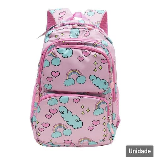 Mochila Juvenil 18'' 46cm Arco-íris A Mochila Juvenil 18" 46cm Arco-Íris é perfeita para quem busca estilo e praticidade. Com design vibrante e colorido inspirado no arco-íris, ela traz um toque de alegria e personalidade ao visual. Seu tamanho de 46 cm oferece amplo espaço para guardar livros, cadernos e outros itens essenciais. As alças ajustáveis garantem conforto, enquanto o material resistente assegura durabilidade. Sua estrutura inclui 4 compartimentos com zíper e 2 bolsos laterais para garrafas, proporcionando amplo espaço e organização. Ideal para o dia a dia, essa mochila combina funcionalidade, conforto e um visual cheio de cor e personalidade.\nEspecificações:\nMarca : Tings\nTipo de material : Poliéster\nCores ou Estampa : Colorido\nDimensões do Produto : 46 X 28 X 19 CM\nDimensões da Embalagem : 45 X 35 X 5 CM\nPeso Bruto (Gramas) : 0.574