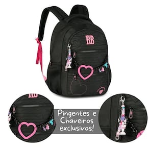 Cada detalhe foi pensado para encantar: chaveiro de miçangas exclusivo com mascote em 3D, corrente estilizada com coração emborrachado e puxadores de zíper personalizados que completam o design sofisticado. As alças de costas são acolchoadas, ajustáveis e extremamente confortáveis, enquanto a alça de mão superior e a alça carona facilitam o transporte em qualquer ocasião.