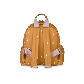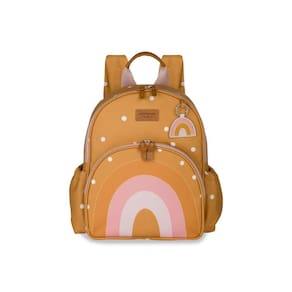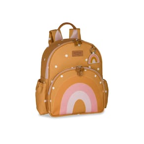 Características: - Mala em material resistente na cor mostarda com estampa "Arco-Íris"; - 3 Alças sendo 1 alça de mão e 2 alças traseiras reguláveis; - Metais na cor prata e Tag; - 1 Bolso frontal com fechamento em zíper; - Abertura individual com fechamento em zíper duplo; - Amplo espaço interno com 1 compartimento em tela; - 2 Bolsos internos com acabamento em elástico; - 2 Bolsos externos laterais para garrafinhas e acessórios; - Acompanha 1 estojo estampado; - Forro emborrachado para facilitar a higienização;