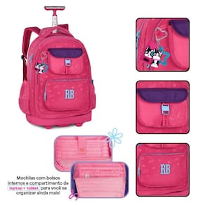 Este Kit é a combinação perfeita para quem busca elegância, organização e muita praticidade no dia a dia escolar. A mochila RB26222 é um modelo super premium da Rebecca Bonbon, desenvolvida em material soft com acabamento em jacquard, trazendo um visual moderno, resistente e muito sofisticado. Possui zíperes coloridos, cadarço logado acetinado e estampa personalizada que dão um charme único à peça. O compartimento principal é extremamente espaçoso e conta com espaço reservado para notebook, garantindo praticidade para a rotina escolar. Na parte frontal, ela oferece mais três compartimentos com fechamento por zíper, incluindo dois bolsos estilosos que facilitam a organização dos itens do dia a dia. Nas laterais, bolsos telados perfeitos para garrafinhas ou objetos de acesso rápido. O modelo é 2 em 1, podendo ser tanto nas costas, com alças acolchoadas super confortáveis, quanto no modo carrinho, com puxador e rodinhas resistentes. Quando Utilizado nas costas, voce pode prroteger as rodinhas para não sujar sua roupa Acompanha chaveiro-tag de borracha e penduricalhos exclusivos da marca. Dimensões aproximadas: 48x35x19cm. O kit acompanha o Estojo Box RB26226, confeccionado no mesmo material soft com silk exclusivo, zíperes coloridos e cadarço logado acetinado. Possui 36 elásticos internos para lápis e canetas e ainda conta com um estojo interno adicional com fechamento próprio, garantindo organização extra. Sua capacidade total comporta cerca de 100 lápis ou canetas, com dimensões aproximadas de 22x16x6cm. A lancheira RB26228 é confeccionada em material resistente, com revestimento térmico que mantém os alimentos na temperatura ideal. Possui compartimento principal espaçoso e mais dois bolsos frontais, todos com fechamento por zíper, além de bolsinhos telados nas laterais. Seu grande diferencial são as alças versáteis: pode ser Utilizado como mochilinha nas costas, no ombro com a alça transversal ou pela alça superior de mão, garantindo praticidade e conforto no dia a dia. Dimensões aproximadas: 27x20x12cm. Um conjunto completo, moderno e perfeito para quem deseja qualidade premium e organização impecável todos os dias.