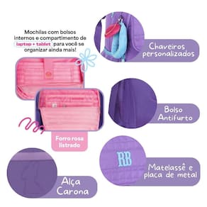 Uma combinação perfeita para o dia a dia: este kit une estilo, funcionalidade e muita praticidade, trazendo a mochila, lancheira e o estojo juntos para deixar tudo ainda mais organizado. Mochila confeccionada em material soft com matelassê e placa de metal colorido, ela traz um charme único graças à alça de pelúcia e aos chaveiros de pelúcia que deixam o visual ainda mais encantador. Seu compartimento principal é espaçoso e conta com área acolchoada ideal para notebook e tablet. Na parte frontal, possui um compartimento grande com divisórias internas para organizar pequenos objetos, além de mais três bolsos frontais funcionais. Tem bolsos telados nas laterais, bolso antifurto na parte de trás e alça carona para acoplar em puxadores de malas. Dimensões aproximadas: 44x33x14cm. Acompanha a lancheira RB26241, que é térmica, possui dois compartimentos com fechamento por zíper e pode ser Utilizado tanto nas costas quanto transversal, além do bolso telado lateral. Dimensões aproximadas: 27x20x12cm. O kit fica completo com o estojo box tradicional da linha, confeccionado em material soft, com capacidade para 36 lápis nos elásticos, mais compartimento interno separado e fechado por zíper, medindo aproximadamente 22x16x6cm. Uma oportunidade incrível de ter tudo combinando, organizado e pronto para a rotina escolar. Marca: Não Informado