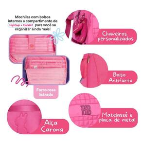 Uma combinação perfeita para o dia a dia: este kit une estilo, funcionalidade e muita praticidade, trazendo a mochila, lancheira e o estojo juntos para deixar tudo ainda mais organizado. Mochila confeccionada em material soft com matelassê e placa de metal colorido, ela traz um charme único graças à alça de pelúcia e aos chaveiros de pelúcia que deixam o visual ainda mais encantador. Seu compartimento principal é espaçoso e conta com área acolchoada ideal para notebook e tablet. Na parte frontal, possui um compartimento grande com divisórias internas para organizar pequenos objetos, além de mais três bolsos frontais funcionais. Tem bolsos telados nas laterais, bolso antifurto na parte de trás e alça carona para acoplar em puxadores de malas. Dimensões aproximadas: 44x33x14cm. Acompanha a lancheira RB26241, que é térmica, possui dois compartimentos com fechamento por zíper e pode ser Utilizado tanto nas costas quanto transversal, além do bolso telado lateral. Dimensões aproximadas: 27x20x12cm. O kit fica completo com o estojo box tradicional da linha, confeccionado em material soft, com capacidade para 36 lápis nos elásticos, mais compartimento interno separado e fechado por zíper, medindo aproximadamente 22x16x6cm. Uma oportunidade incrível de ter tudo combinando, organizado e pronto para a rotina escolar.