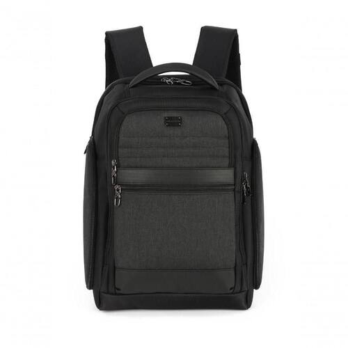 Além disso, a mochila dispõe de dois bolsos frontais amplos e bolsos laterais com fechamento em zíper, ideais para garrafas, cabos ou outros acessórios de uso frequente. Confeccionada em poliéster resistente com detalhes em PU (couro sintético), apresenta visual executivo e alta durabilidade.