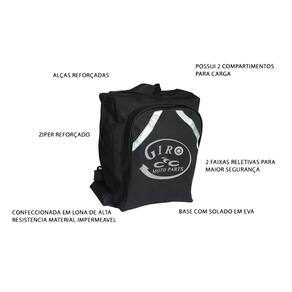 Loja Oficial Giro Moto Parts A Mochila reforçada da Giro Moto Parts by Piracapas é perfeita para viagens de moto ou para serviços de motoboy e entregas. Conta com 02 bolsos para carga, alça manual na parte superior, alças reforçadas, base emborrachada e faixas reletivas.Especificações:• Marca: Piracapas• Medidas: Largura: 46cm / Altura: 70cm / Profundidade: 30cm• Capacidade: 96 Litros• Tamanho: GG• Material: Nylon impermeabilizado, Argolas frontais em ferro e abs reforçado, reforçada em lonaConteúdo da Embalagem:01- Mochila De Lona Entrega Motoqueiro Logo Giro Moto Parts Tamanho GG Ean: 7899738007923