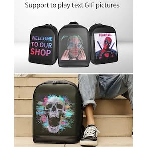 Como usar: Antes de usar a mochila com display LED, é necessário preparar Power Bank de 10.000 mAh. Baixe o aplicativo ledspace na app store, a porta USB integrada (dentro da mochila) se conecta à energia móvel. Ligue o seu celular. O dispositivo Bluetooth está conectado corretamente e abra o aplicativo. Você pode adicionar legendas, animações GIF e imagens e exibi-las na tela de LED. A energia móvel de 10.000 mAh pode alimentar a mochila por 6 horas