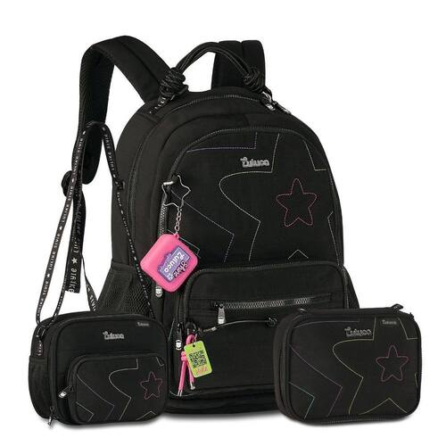 O kit escolar Luluca une estilo, organização e praticidade em um só conjunto. A mochila LU27033 é o destaque, com design moderno, matelassê de estrelas coloridas, chaveiros exclusivos e acabamento sofisticado. Oferece compartimento principal espaçoso, divisórias acolchoadas para notebook e tablet, três bolsos frontais - um deles organizador - e bolsos laterais ideais para garrafinhas. Além disso, possui bolso antifurto traseiro, alça carona para malas e alça superior em corda, sem esquecer do conforto das alças acolchoadas. Para completar, a lancheira térmica LU27031 garante que os alimentos fiquem sempre bem conservados. Possui compartimento principal e bolsinho frontal, ambos com fechamento em zíper, além de bolso telado lateral. É prática e versátil, com alça de ombro e alça carona para acoplar à mochila ou mala. O estojo box LU27032 dá o toque final de organização: confeccionado em poliéster com matelassê de estrelas, tem espaço para até 100 lápis ou canetas, 36 elásticos para fixar os itens e ainda um estojo interno separado com fechamento em zíper. Dimensões aproximadas: Mochila: 44x33x14cm Lancheira: 20x24x14cm Estojo: 22x16x6cm Marca: Não Informado