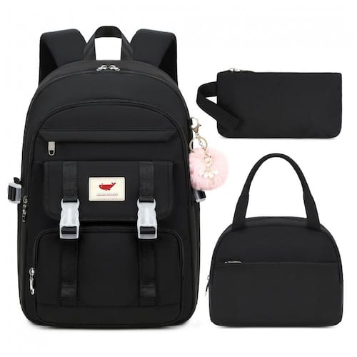 Conjunto 3 em 1 composto por mochila principal, lancheira e estojo, indicado para adolescentes, estudantes e mulheres em rotinas de estudo, trabalho, viagens curtas e uso diário. A mochila comporta notebook de até 16 polegadas em compartimento acolchoado, além de cadernos, livros, tablet, estojo, carregadores e itens pessoais distribuídos em múltiplos bolsos internos e externos.