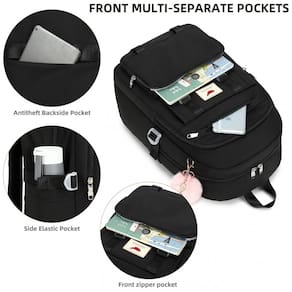 Bolsos frontais: 1 bolso frontal tipo organizador com múltiplos compartimentos para celular, documentos, cabos e pequenos acessórios, mais bolsos adicionais frontais menores
