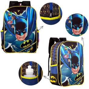 Kit Mochila Escolar Infantil Batman, acompanha lancheira e estojo. Possui alça de mão reforçada. Agora você pode levar sua mochila no seu dia a dia ou acompanhar você na escola. Sua abertura maior se dá por zíper com puxador. Na parte de dentro possui amplo espaço para a guardar diversos materiais como cadernos, livros e estojos. Na parte da frente, possui bolso com zíper para a guardar pertences de menor tamanho e bolsos laterais.