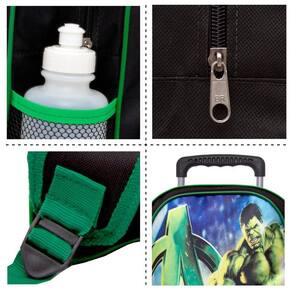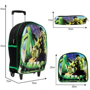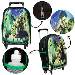 Kit Mochila Escolar Infantil Incrível Hulk Rodinhas, acompanha lancheira e estojo. Possui alça de mão reforçada. Agora você pode levar sua mochila no seu dia a dia ou acompanhar você na escola. Sua abertura maior se dá por zíper com puxador. Na parte de dentro possui amplo espaço para a guardar diversos materiais como cadernos, livros e estojos. Na parte da frente, possui bolso com zíper para a guardar pertences de menor tamanho e bolsos laterais.