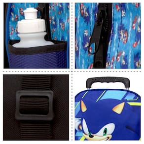 Kit Mochila Escolar Infantil Sonic Rodinhas, acompanha lancheira e estojo. Possui alça de mão reforçada. Agora você pode levar sua mochila no seu dia a dia ou acompanhar você na escola. Sua abertura maior se dá por zíper com puxador. Na parte de dentro possui amplo espaço para a guardar diversos materiais como cadernos, livros e estojos. Na parte da frente, possui bolso com zíper para a guardar pertences de menor tamanho e bolsos laterais.