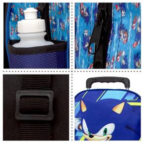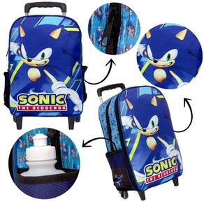 Kit Mochila Escolar Infantil Sonic Rodinhas, acompanha lancheira e estojo. Possui alça de mão reforçada. Agora você pode levar sua mochila no seu dia a dia ou acompanhar você na escola. Sua abertura maior se dá por zíper com puxador. Na parte de dentro possui amplo espaço para a guardar diversos materiais como cadernos, livros e estojos. Na parte da frente, possui bolso com zíper para a guardar pertences de menor tamanho e bolsos laterais.