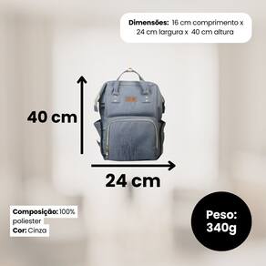 Especificações: Dimensões: 16 cm comprimento x 24 cm largura x 40 cm altura Composição: 100% poliester Cor: Cinza Peso: 340g