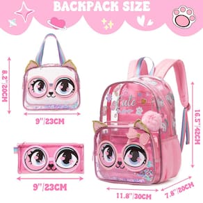 - Mochila 4 em 1 para meninas, você receberá 1 mochila, 1 lancheira, 1 estojo de lápis e 1 pingente. Mochila: 40 x 20 x 19 cm. Lancheira: 22,8 x 10 cm. Estojo: 23 cm