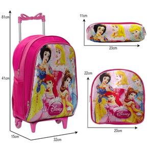 Kit Mochila Escolar Infantil Princesas Rodinhas, acompanha lancheira e estojo. Possui alça de mão reforçada. Agora você pode levar sua mochila no seu dia a dia ou acompanhar você na escola. Sua abertura maior se dá por zíper com puxador. Na parte de dentro possui amplo espaço para a guardar diversos materiais como cadernos, livros e estojos. Na parte da frente, possui bolso com zíper para a guardar pertences de menor tamanho e bolsos laterais.