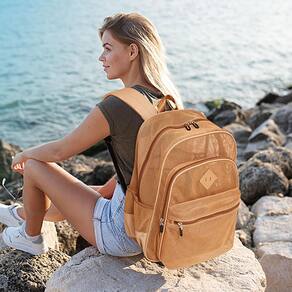 Mochila de malha MOONBABY Heavy Duty Transparente Mochila escolar transparente para natação, praia, esportes, trabalho, viagens (cáqui) - 🌊 RESPIRÁVEL: a mochila de malha grande é feita de malha de poliéster respirável, é bastante adequada para carregar para a praia. Você nunca se preocupará com areia caindo em sua mochila ou com seus trajes de banho molhados cheirando mal. - ? MUITOS QUARTOS: mochila resistente e transparente com vários compartimentos e bolsos, o suficiente para guardar material escolar, material de trabalho, itens esportivos, itens essenciais para a praia ou para viagens, caminhadas, acampamentos, compras e itens hospitalares. - ? Leve e confortável: a mochila clássica de malha transparente foi projetada com alças respiráveis e respiráveis em forma de S, que engrossam e ampliam, cabe perfeitamente nos ombros, o que libera a pressão dos ombros quando você carrega cargas mais pesadas. - 👍 VERIFICAÇÃO DE SEGURANÇA: A mochila de malha é a escolha ideal, atende aos requisitos de segurança das escolas e é muito mais fria do que a mochila comum, além de passar rapidamente pelos postos de controle de segurança. Mochila perfeita, recomendada para crianças, adolescentes, mulheres e homens. - 🆒 DIMENSÕES: 13* 5,5* 17,3 pol/33* 14* 44 cm (L* W* H), peso: 1,21 lb/0,55 kg. O recurso leve reduzirá o peso da embalagem e facilitará o transporte.