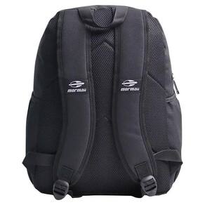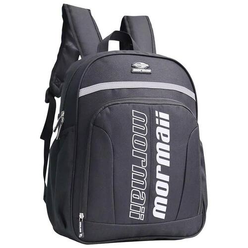 Mochila Mormaii com costuras duplas reforçadas, alça superior para ser pendurada, zíper biderecionais, bolsos laterais, alças nas costas acolchoadas e ajustáveis.