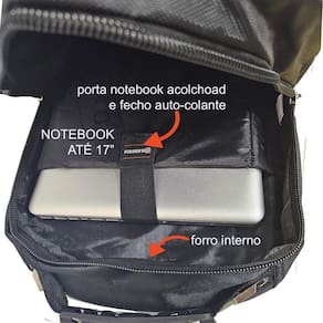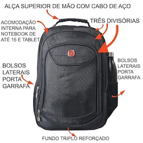- Compartimento principal com zíper duplo reforçado - Compartimento interno acolchoado e fecho - garantindo a proteção extra do seu laptop - Compartimento central com zºiper - Compartimento frontal com divisorias internas organizadoras de canetas, celular, chave, agenda etc - Bolso frontal com ziper - Bolsos laterais em tela e elastico - Cabo de aço - MAIS FORTE! - Sistema de FLUXO DE AR Nas costas - Costas acolchoadas - Alças acolchoadas e ajustaveis