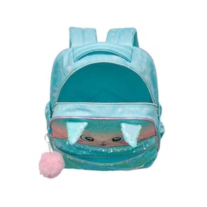Mochila Pacific Pack Me Raposa Sweet Fox Orelhas 3D Azul A mochila combina charme e funcionalidade com estampa brilhante em cetim, painel frontal com glitter, orelhas 3D em paetê e rosto da raposa bordado em veludo. Conta com bolso frontal em lantejoulas vai-e-vem, puxadores de zíper em fita de gorgorão, chaveiro pompom e bolsos laterais ideais para garrafas. Ideal para meninas que buscam estilo e praticidade no dia a dia escolar.