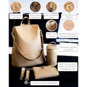 - Materiais premium – ao contrário de outras marcas, esta bolsa de fraldas recentemente redesenhada oferece zíperes YKK da mais alta qualidade, ferragens douradas de luxo, couro vegano premium, interior de nylon fácil de limpar e alças reforçadas para maior durabilidade e conforto