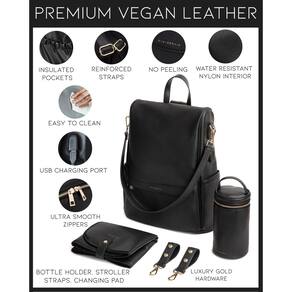 - Materiais premium – ao contrário de outras marcas, esta bolsa de fraldas recentemente redesenhada oferece zíperes YKK da mais alta qualidade, ferragens douradas de luxo, couro vegano premium, interior de nylon fácil de limpar e alças reforçadas para maior durabilidade e conforto