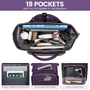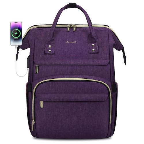LOVEVOOK Mochila feminina para laptop moderna, bolsa de viagem, bolsa de trabalho para computador de negócios com porta USB, Roxo escuro, Moderno - ?Qualidade atualizada e grande capacidade?: Zíperes de metal antiderrapantes duplos atualizados. Tecido de poliéster resistente à água e durável, costuras especialmente reforçadas. Alça e alças de ombro confortáveis e resistentes. Todos são resistentes e duráveis. Dimensões: 30 cm C x 43 cm A x 19 cm P, Peso: 1 kg. Total de 2 compartimentos e 19 bolsos para o seu computador, necessidades de trabalho, suprimentos universitários e itens essenciais de viagem. - Mochilas de trabalho para professores e enfermeiras abertas?: As bordas reforçadas e a estrutura de aço do compartimento principal mantêm a forma perfeita da bolsa, a parte superior abre, você pode ver suas coisas facilmente e acessar rapidamente, mais facilmente organizada. Mochila de professor com compartimento para laptop, bolsas de enfermeiras e bolsas para trabalho, mochila de trabalho para mulheres profissionais. - Mochila feminina acolchoada para laptop e bolsas de computador: o compartimento acolchoado embutido para laptop com algodão acolchoado é compatível com laptop de até 17 polegadas, esta bolsa feminina vem com uma alça elástica que oferece a proteção ideal para o seu laptop, compartimento para tablet compatível com laptop de 13,3 polegadas, iPad de 12,9 polegadas. Ótima ideia de mochila para qualquer pessoa com vários dispositivos eletrônicos. - ?Ótima mochila de viagem aprovada por companhias aéreas com porta USB?: Mochila para viajar de avião. Tamanho perfeito para caber sob o assento do avião. A alça de bagagem permite que a mochila se encaixe na bagagem/mala para facilitar o transporte. O bolso traseiro oculto protege seus itens valiosos de ladrões. Com cabo de carregamento interno e porta USB externa, a linda mochila oferece uma maneira mais conveniente de carregar seus dispositivos. - ??Presentes práticos e garantia de qualidade?: Esta bolsa de laptop feminina foi bem feita para o trabalho, negócios, viagens, deslocamento, faculdade, professor, enfermeira, uso diário. Presentes práticos para todas as pessoas de quem você gosta. A mochila feminina para laptop LOVEVOOK oferece atendimento ao cliente em 12 horas, devolução sem motivo em 30 dias e política de garantia de 1 ano.