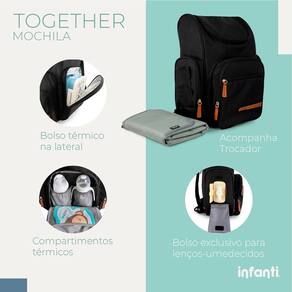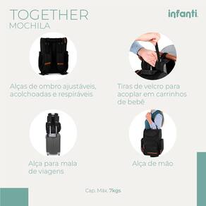 A Mochila Together da Infanti é prática, moderna e funcional, ideal para os passeios com o bebê. Com divisórias internas, bolso térmico para mamadeiras, porta-lenços, trocador acolchoado e alças ajustáveis, ela pode ser usada de 4 formas: nas costas, nas mãos, presa à mala ou fixada no carrinho. Organize tudo com estilo e praticidade!