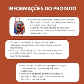 1 Bolso Principal e 2 Laterais para garrafinhas; Mochila de rodinhas e puxador resistente; Estampa Personalizada Spidey Amazing Friends; Ean: 7899768848763