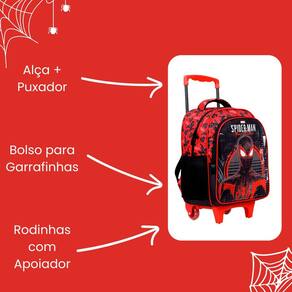 1 Bolso Principal, 1 frontal e 2 Laterais para garrafinhas; Mochila de rodinhas e puxador resistente; Estampa Personalizada Spider Man Miles Morales; Alça de Costas.