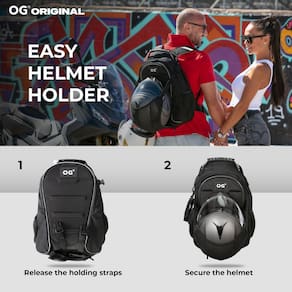 - ATÉ DOIS CAPACETES: Sistema DHT pioneiro (transporte de capacete duplo), ele possui três maneiras diferentes de transportar seu capacete, até mesmo até duas simultaneamente. Um no suporte elástico ajustável incorporado do capacete, ou colocado no espaçoso interior expansível de até 35 litros de capacidade e/ou pendurado na alça lateral do capacete.