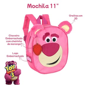 Características: - Mochila 11" - Estampa fofa e exclusiva do Lotso - Logo emborrachado - Fechamento com zíper reforçado - Chaveiro emborrachado com cheiro de morango