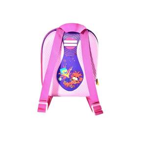 Confeccionada em EVA de alta qualidade e resistência, proporcionando um corpo rígido mas bastante flexível, processo patenteado e exclusivo. Não tem nada igual no mundo. Sistema de fechamento com zíper de qualidade. Seu interior possui um compartimento com uma malha elástica. Possui 2 alças de costas em nylon, com fivelas de ajuste em plástico, alça de mão em nylon na parte superior, superfície interna e externa impermeáveis, o que protege contra sujeiras e facilita a limpeza. Basta um pano úmido. Área de identificação onde pode ser colocado o nome da criança, o nome dos pais e telefones de contato.