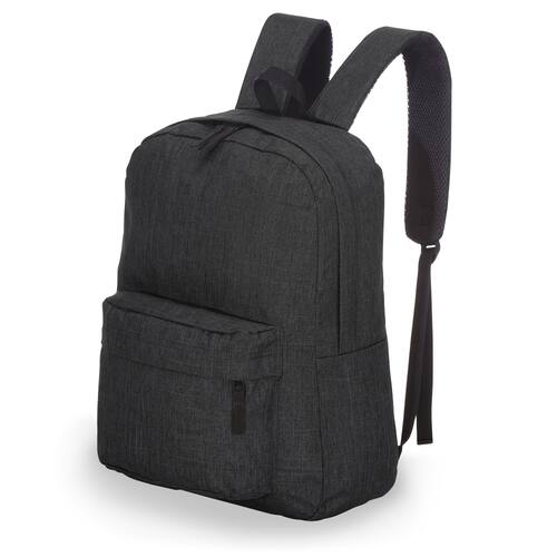 Mochila sem compartimento para notebook em tecido poliéster, com bolso frontal com zipér, além de alça de mão e de ombro.