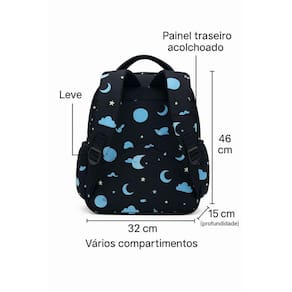 Mochila Preta Escolar Infantil com Alças Acolchoadas Essa mochila infantil unissex é ideal para o dia a dia escolar, oferecendo conforto, praticidade e um visual encantador. Com estampa de luas, estrelas e nuvens em fundo preto, ela é perfeita para meninos e meninas que buscam estilo e funcionalidade. Características do Produto:
